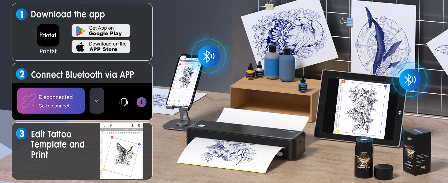 - Portable & Compact - Weighs only 1.5 pounds, much smaller than traditional tattoo transfer machines, offering portability and convenience. Lightweight and compact, this tattoo stencil printer is perfect for both home studios and on-the-go artists. Its portable design makes it easy to take to conventions, guest spots, or client locations.