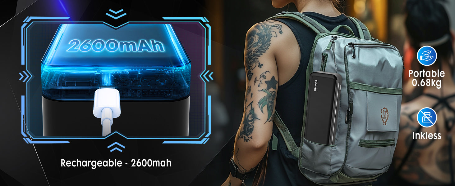 - Inkless & Rechargeable - The tattoo stencil machine features a built-in 2600mAh battery for up to 360 prints per charge, and advanced thermal technology for precise, ink-free stencils with minimal maintenance. Accessories include 40 thermal transfer papers, 2 instructional cards, a user manual, and 2 USB cables. Professional customer support is available via phone, email, and remote assistance.
