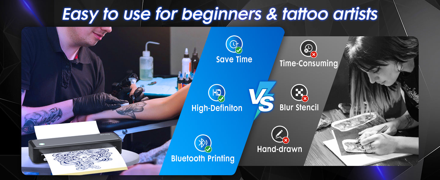 - Time-Saving & User-Friendly Design - With a simple setup and intuitive controls, this printer is easy to use for both beginners and experienced tattoo artists. It’s compatible with A4 size tattoo stencil paper, making it a versatile tool in most studios. Say goodbye to time-consuming hand-drawing stencils. The printer speeds up the design process, allowing you to focus more on your craft and less on manual preparation.