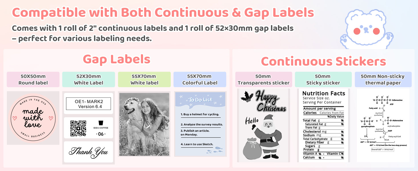 - Ink-Free Thermal Printing Technology - Enjoy clean, cost-effective printing with advanced thermal technology—no ink, toner, or ribbons required. This upgraded version is compatible with both continuous and gap labels, as well as sticky or non-sticky paper. It also supports multiple roll types, including standard white, colored, and transparent sticker paper (2-inch width).
